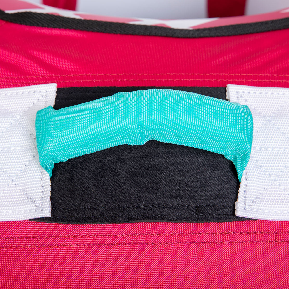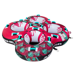 Few towable boat floats offer family fun like Blast 4, a 4 person towable tube. Blast 4 boasts a red and teal tropical pattern, 16 neoprene comfort handles, and a self-draining floor that keeps riders upright no matter how much splashing happens.